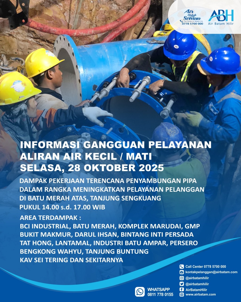 Dailykepri.com| Batam – Air Batam Hilir (ABH) akan melaksanakan pekerjaan terencana berupa penyambungan pipa berdiameter 225mm di kawasan Batu Merah Atas, Tanjung Sengkuang. Proyek ini bertujuan untuk meningkatkan kualitas dan kontinuitas suplai air bersih bagi pelanggan di wilayah terdampak.