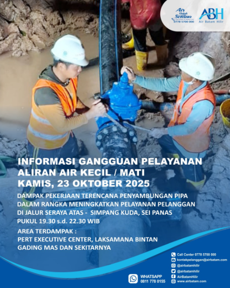 Dalam keterangan resminya, pihak ABH menyampaikan bahwa selama proses pekerjaan berlangsung, akan terjadi gangguan pelayanan berupa aliran air kecil hingga terhenti sementara. Wilayah yang diperkirakan terdampak meliputi Pert Executive Center, Gading Mas, Laksamana Bintan, dan sekitarnya.