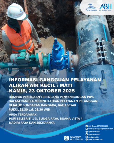 “Kami menghimbau kepada seluruh pelanggan di wilayah terdampak untuk dapat menampung air secukupnya sebagai antisipasi kebutuhan sehari-hari selama pekerjaan berlangsung,” ujar perwakilan Air Batam Hilir dalam keterangan tertulis.