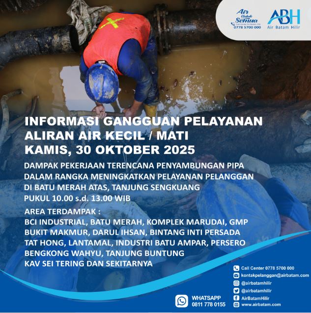 Dailykepri.com | Tanjung Sengkuang – Air Batam Hilir (ABH) mengumumkan akan melaksanakan pekerjaan terencana berupa penyambungan pipa berdiameter 225 mm di kawasan Batu Merah Atas, Tanjung Sengkuang, pada Kamis, 30 Oktober 2025, pukul 10.00 hingga 13.00 WIB. Kegiatan ini bertujuan untuk meningkatkan suplai air kepada pelanggan di wilayah tersebut.