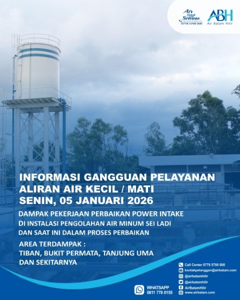 Air Batam Hilir menyampaikan permohonan maaf atas ketidaknyamanan yang ditimbulkan dan mengimbau masyarakat untuk melakukan penampungan air secukupnya selama masa perbaikan berlangsung.