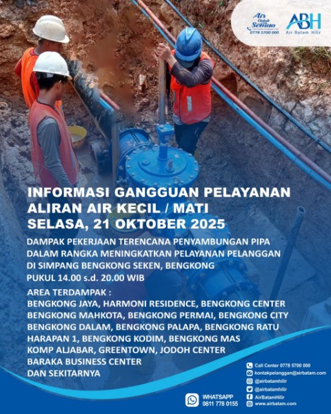 Informasi lebih lanjut dapat diperoleh melalui Kantor Pelayanan Pelanggan di Bengkong, Batu Aji, dan Batam Center, serta melalui Call Center (0778) 5700 000, WhatsApp 0811 778 0155, aplikasi mobile Air Batam Hilir, dan kanal media sosial resmi seperti Instagram, Twitter, Facebook, serta situs web www.airbatam.com dan email kontakpelanggan@airbatam.com.