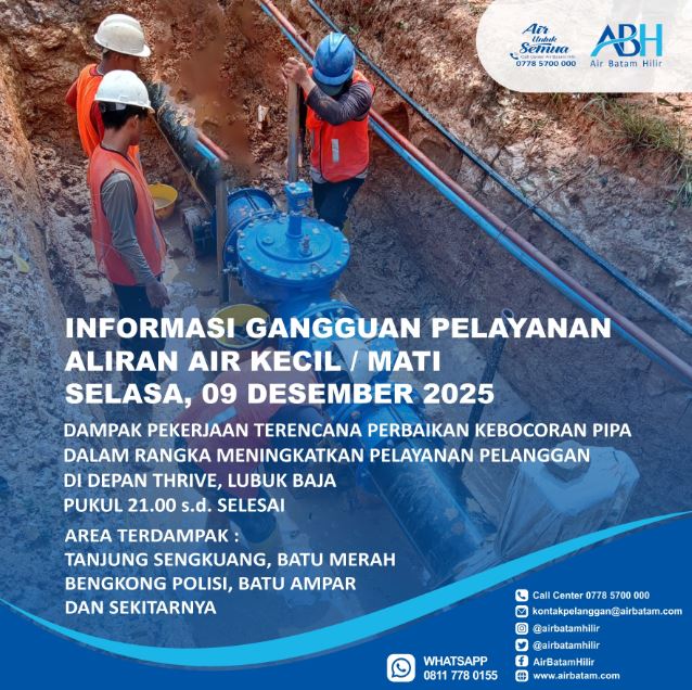 Dailykepri.com | Batam – Air Batam Hilir mengumumkan akan melakukan pekerjaan terencana berupa perbaikan kebocoran pipa steel berdiameter 400 milimeter yang berlokasi di depan kawasan Thrive, Lubuk Baja, pada Selasa, 9 Desember 2025 mulai pukul 21.00 WIB hingga selesai. Kegiatan ini diperkirakan akan berdampak langsung terhadap gangguan suplai air minum di sejumlah wilayah di Kota Batam.