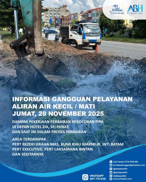 “Pekerjaan perbaikan pipa bocor di depan Hotel Zia, Sei Panas, sedang berlangsung. Proses ini berdampak pada gangguan suplai air minum, baik berupa tekanan air yang mengecil maupun terhentinya aliran air secara total di beberapa titik,” demikian pernyataan resmi dari Air Batam Hilir.