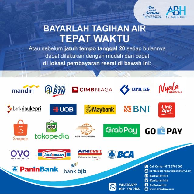 Permintaan pembayaran dan penanganan keluhan dapat dilakukan melalui Kantor Pelayanan Pelanggan (KPP) di Bengkong, Batu Aji, dan HO Batam Center; Call Center Air Batam Hilir di (0778) 5700 000; WhatsApp 0811 778 0155; aplikasi mobile Air Batam Hilir; serta akun media sosial Instagram @airbatamhilir, Twitter @airbatamhilir, dan Facebook airbatamhilir. Informasi lengkap juga tersedia di situs resmi www.airbatam.com dan melalui email kontakpelanggan@airbatam.com.
