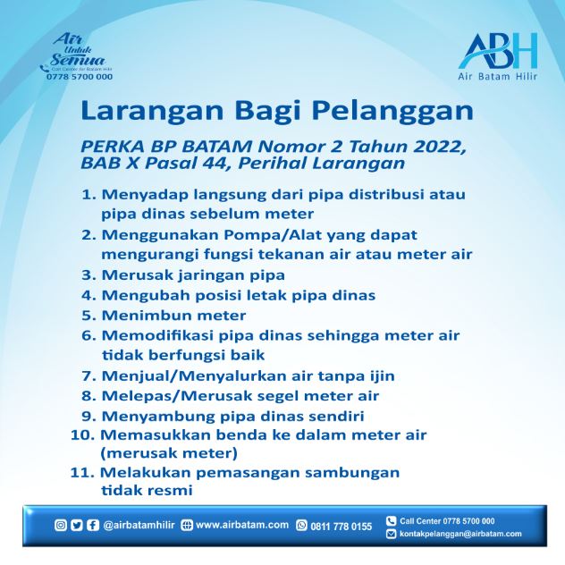 Dailykepri.com | Batam – Air Batam Hilir menegaskan kembali aturan yang tercantum dalam PERKA BP Batam Nomor 2 Tahun 2022 Bab X Pasal 44 mengenai 11 larangan bagi pelanggan. Aturan ini diberlakukan untuk menjaga keandalan sistem distribusi air dan melindungi hak seluruh pelanggan.