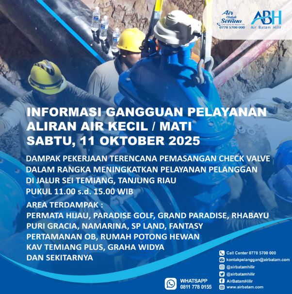 Pemasangan Check Valve ini merupakan bagian dari program peningkatan suplai air minum yang ditujukan untuk memperbaiki sistem distribusi dan memastikan aliran air yang lebih stabil ke pelanggan di wilayah tersebut. Namun, selama proses pengerjaan berlangsung, Air Batam Hilir menginformasikan bahwa akan terjadi gangguan sementara pada pelayanan air minum. Gangguan tersebut berupa aliran air yang mengecil hingga terhenti total di sejumlah titik.