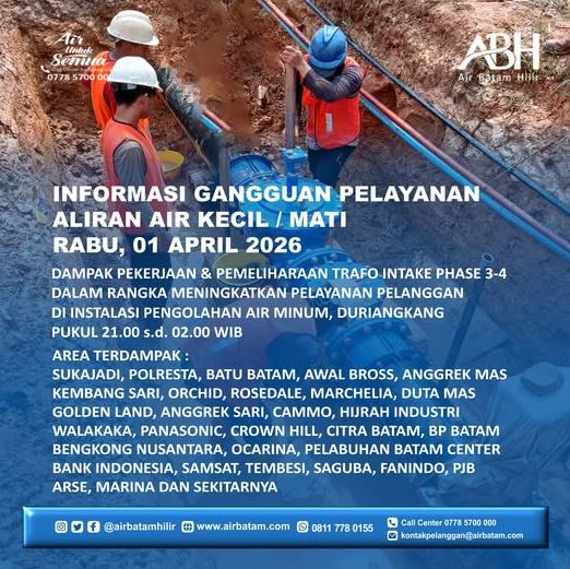Dailykepri.com | Batam – Air Batam Hilir mengumumkan akan melaksanakan pekerjaan pemeliharaan Trafo Intake Phase 3-4 di Instalasi Pengolahan Air Minum Duriangkang pada Rabu, 1 April 2026, pukul 21.00 hingga 02.00 WIB. Selama proses tersebut, suplai air minum di sejumlah wilayah akan mengalami gangguan berupa tekanan air kecil hingga terhenti sementara.