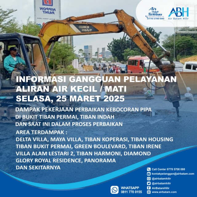 Air Batam Hilir menyampaikan permohonan maaf atas ketidaknyamanan yang ditimbulkan dan berkomitmen untuk menyelesaikan pekerjaan ini secepat mungkin agar suplai air bersih di area terdampak kembali normal.
