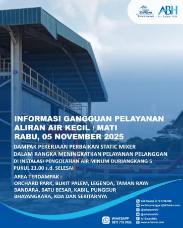 Pekerjaan ini merupakan bagian dari komitmen Air Batam Hilir untuk terus meningkatkan efisiensi dan kualitas layanan air minum. Namun, selama proses perbaikan berlangsung, pelanggan di sejumlah wilayah akan mengalami gangguan distribusi air berupa tekanan air yang melemah hingga terhentinya aliran air secara sementara.
