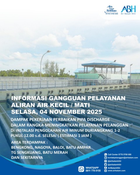 Dailykepri.com | Batam — Air Batam Hilir (ABH) mengumumkan akan melakukan pekerjaan perbaikan kebocoran pipa discharge di Instalasi Pengolahan Air Minum (IPAM) Duriangkang 1-2 pada Selasa, 4 November 2025, mulai pukul 12.00 WIB hingga selesai. Pekerjaan ini diperkirakan berlangsung selama satu jam dan akan berdampak langsung terhadap suplai air minum di sejumlah wilayah di Kota Batam.