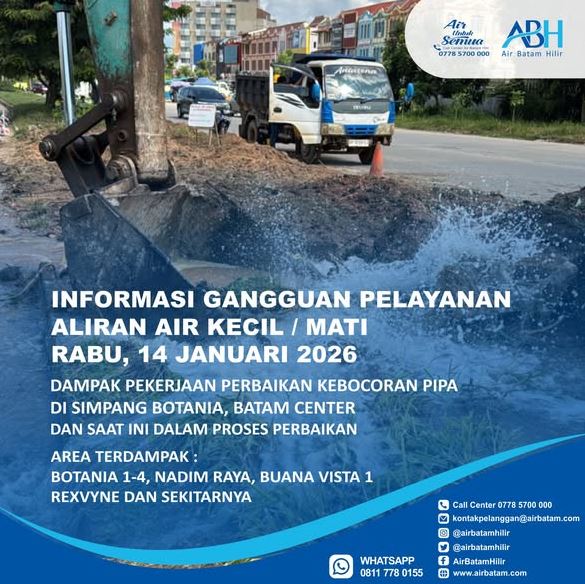 Dalam keterangan resminya, Air Batam Hilir menyampaikan bahwa selama pekerjaan berlangsung, pelanggan akan mengalami gangguan berupa aliran air kecil hingga terhenti sementara waktu. Wilayah yang terdampak meliputi Botania 1 hingga Botania 4, kawasan perumahan Rexvyn, Buana Vista 2, Nadim Raya, serta area sekitarnya.