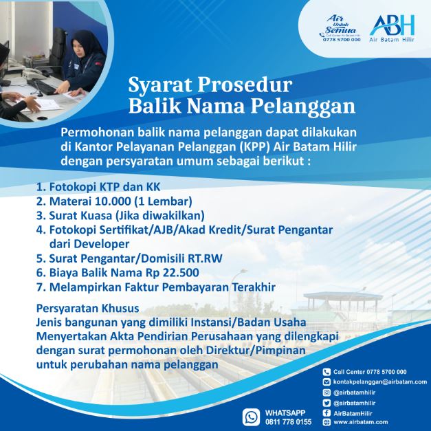 Lebih lanjut, Air Batam Hilir menambahkan bahwa data pelanggan yang akurat akan meminimalkan potensi kesalahan dalam penagihan serta mempercepat proses penanganan keluhan atau permintaan teknis. “Kami mengimbau kepada seluruh pelanggan yang telah melakukan transaksi jual beli properti atau perubahan kepemilikan untuk segera mengurus Balik Nama agar tidak terjadi kendala di kemudian hari,” katanya.