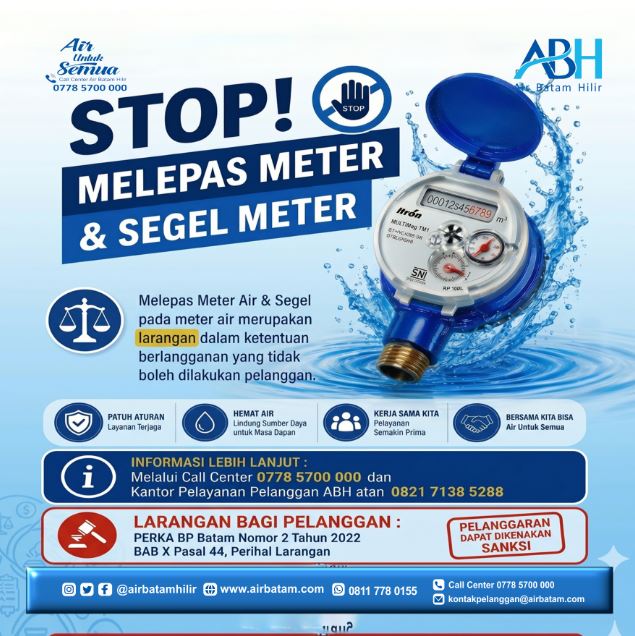 Dailykepri.com | Batam – Air Batam Hilir menegaskan larangan bagi pelanggan untuk melepas meter maupun segel pada meter air, sesuai ketentuan berlangganan yang diatur dalam PERKA BP Batam Nomor 2 Tahun 2022 BAB X Pasal 44. Tindakan tersebut dapat menimbulkan kerugian berupa penurunan tekanan air dan terganggunya distribusi ke pelanggan lain.
