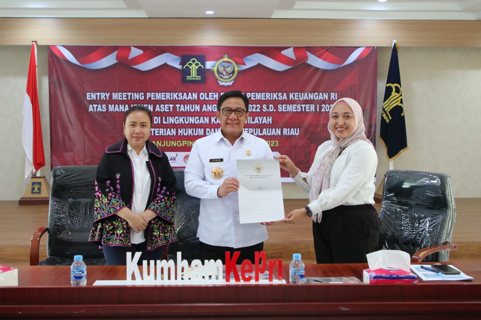 Hadir dalam kegiatan ini Kakanwil Kemenkumham Kepri Saffar Muhammad Godam, Ketua Tim Pemeriksa BPK RI Firdia Ifana, Kabiro Pengelolaan BMN Kemenkumham RI Novita Ilmaris, Pimpinan Tinggi Pratama dan Kepala Satuan Kerja Kemenkumham Kepri.
