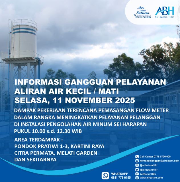 Manajemen Air Batam Hilir menginformasikan bahwa selama proses pekerjaan berlangsung, akan terjadi dampak sementara pada suplai air minum kepada pelanggan di beberapa area.