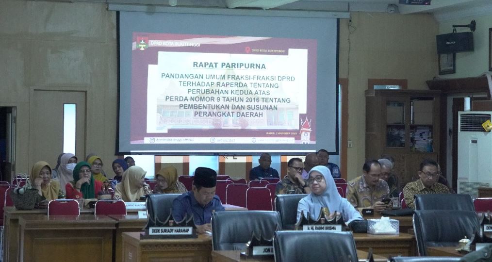 Dailykepri.com | Bukittinggi – DPRD Kota Bukittinggi menggelar rapat paripurna dengan agenda penyampaian pandangan umum fraksi-fraksi terhadap Rancangan Perubahan Kedua Peraturan Daerah Nomor 9 Tahun 2016 tentang Pembentukan dan Susunan Perangkat Daerah. Rapat dilaksanakan di Kantor DPRD Kota Bukittinggi, Kamis, 2 Oktober 2025.