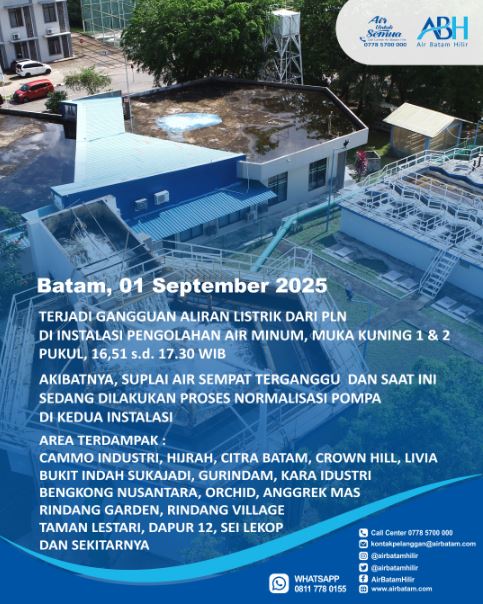Dailykepri.com | Batam – Air Batam Hilir menyampaikan informasi kepada pelanggan terkait gangguan suplai air minum yang terjadi akibat terputusnya aliran listrik dari PLN di Instalasi Pengolahan Air Minum Muka Kuning 1 dan 2. Gangguan tersebut terjadi pada Senin, 1 September 2025, pukul 16.51 hingga 17.30 WIB, dan berdampak langsung pada distribusi air ke sejumlah kawasan.