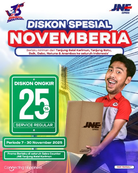 Mulai tanggal 7 hingga 30 November 2025, pelanggan yang melakukan pengiriman dari Tanjung Balai Karimun, Tanjung Batu, Daik, Dabo, Natuna, dan Anambas ke seluruh wilayah Indonesia berkesempatan mendapatkan diskon ongkir sebesar 25 persen.
