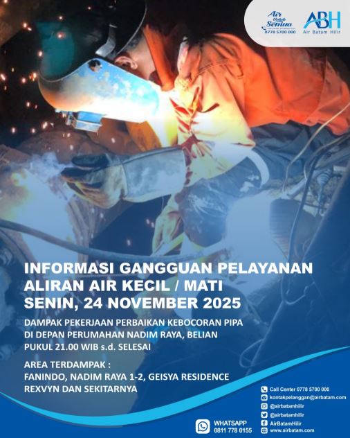 Dailykepri.com | Batam — Warga di sejumlah kawasan Batam diminta bersiap menghadapi gangguan suplai air bersih menyusul pekerjaan perbaikan kebocoran pipa HDPE berdiameter 225 mm yang dilakukan oleh Air Batam Hilir pada Senin malam, 24 November 2025. Pekerjaan dimulai pukul 21.00 WIB dan akan berlangsung hingga selesai.