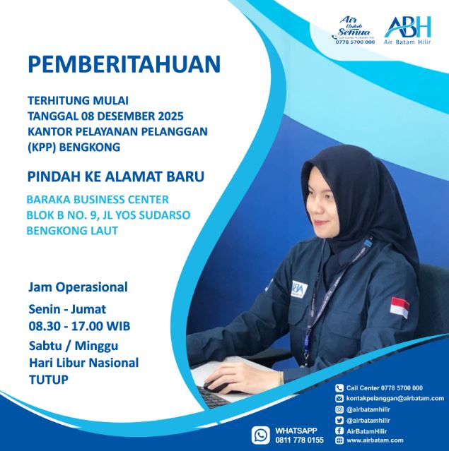 Dailykepri.com | Batam – Dalam rangka meningkatkan kualitas layanan dan memberikan kenyamanan yang lebih baik bagi pelanggan, PT Air Batam Hilir mengumumkan pemindahan Kantor Pelayanan Pelanggan (KPP) Bengkong ke lokasi baru. Efektif mulai 8 Desember 2025, KPP Bengkong akan beroperasi di Komplek Baraka Business Center, Blok B No. 9, Jalan Yos Sudarso, Bengkong Laut.
