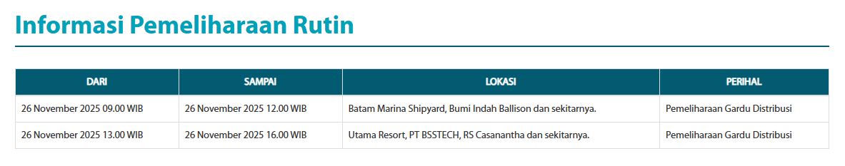 Dailykepri.com | Batam — PT PLN Batam akan melakukan pemeliharaan rutin terhadap gardu distribusi di beberapa wilayah pada Rabu, 26 November 2025. Kegiatan ini akan berdampak pada pemadaman listrik sementara di sejumlah kawasan, sebagai bagian dari upaya perusahaan untuk menjaga keandalan pasokan listrik di wilayah Batam.