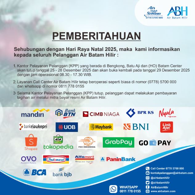 Dailykepri.com | Batam –Air Batam Hilir menginformasikan bahwa Kantor Pelayanan Pelanggan (KPP) di Bengkong, Batu Aji, dan HO Batam Center akan tutup pada 25–28 Desember 2025 dan kembali beroperasi pada 29 Desember 2025, sementara layanan Call Center dan WhatsApp tetap aktif untuk melayani pelanggan. Call Center dapat dihubungi di (0778) 5700 000 dan layanan WhatsApp di 0811 778 0155.