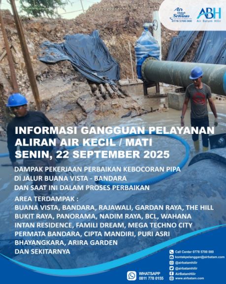 Air Batam Hilir mengimbau pelanggan untuk tetap tenang dan melakukan penghematan air selama masa perbaikan berlangsung. Informasi terkini terkait progres pekerjaan dan status suplai air akan terus diperbarui melalui kanal resmi ABH.