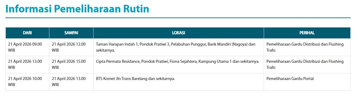 Pekerjaan teknis dijadwalkan berlangsung dalam beberapa sesi sehingga permukiman, fasilitas komersial, dan infrastruktur telekomunikasi di lokasi terdampak akan mengalami pemadaman sementara.
