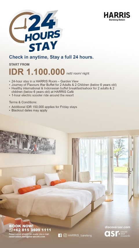 Paket menginap ini ditawarkan mulai dari IDR 1.100.000 nett per kamar per malam untuk tipe HARRIS Room Garden View, yang sudah termasuk iftar buffet untuk 2 orang, sahur atau sarapan untuk 2 dewasa dan 2 anak di bawah 6 tahun, serta 1 jam penggunaan electric scooter.