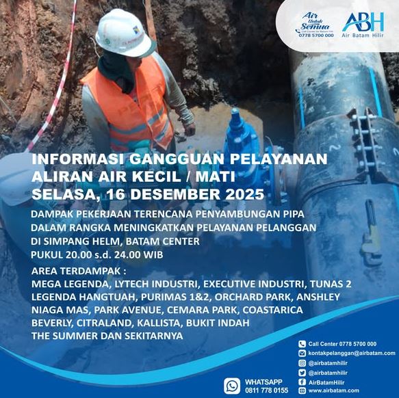 Dailykepri.com | Batam – Air Batam Hilir akan melaksanakan pekerjaan terencana berupa penyambungan pipa Steel 300 mm ke pipa DCIP 300 mm di kawasan Simpang Helm, Batam Center, pada Selasa, 16 Desember 2025, mulai pukul 20.00 hingga 24.00 WIB. Kegiatan ini dipastikan berdampak pada gangguan suplai air minum, berupa tekanan air kecil hingga terhentinya aliran air sementara di sejumlah wilayah.