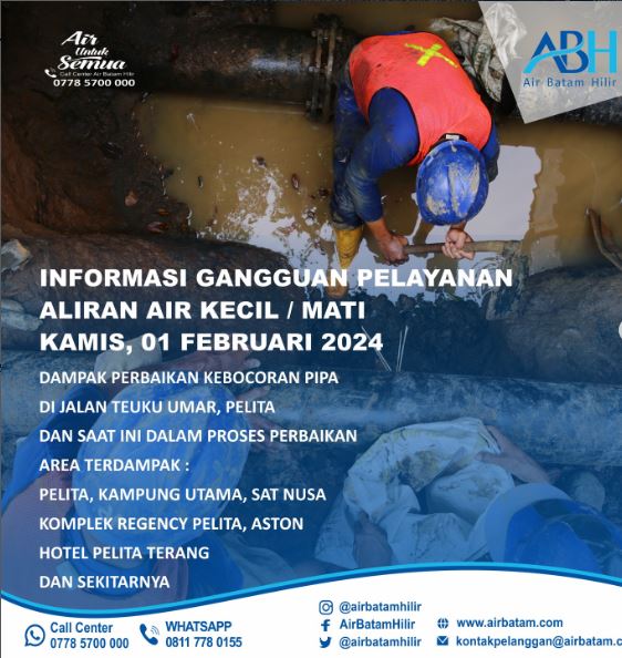 “Adapun area terdampak akibat kebocoran pipa ini yaitu Pelita, Kampung Utama, Sat Nusa, Komp Regency Pelita, Aston Hotel, Hotel Pelita Terang dan sekitarnya,” terang ABH.
